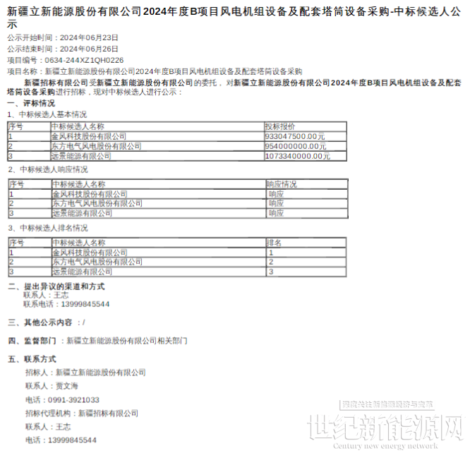 近日,新疆立新能源股份有限公司2024年度B项目风电机组设备及配套塔筒设备采购中标候选人公示,金风科技、东方风电、远景能源3家整机商入选。
