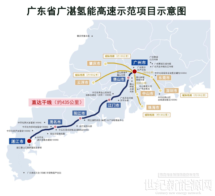 广湛氢能高速示范项目涵盖广州、佛山、东莞、江门、阳江、湛江、茂名等地,辐射珠三角地区。此区域由沈海高速、汕湛高速、207国道、228国道和325国道组成交通大网络,是全省水产品、生鲜肉类、果蔬冷链运输的大动脉,沿线分布了各类大型批发市场和冷库,加氢站布局合理,氢源保障潜力较大,具备发展燃料电池汽车冷链物流的良好条件。