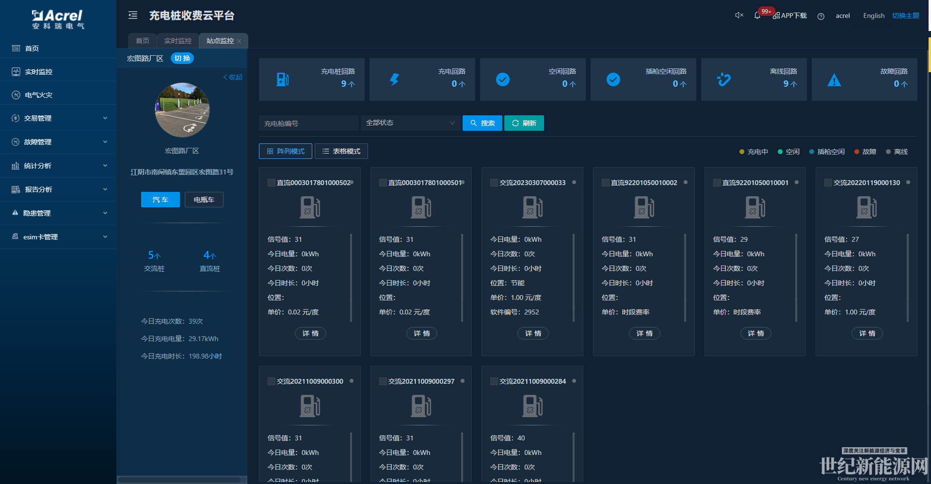 统计当前充电站各充电桩回路的数据;通过卡片的形式展现充电桩的数据;显示故障列表;如图所示: