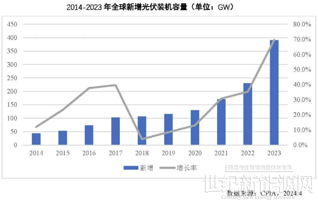 2023年全球光伏新增装机390GW,同比增长69.6%,累计装机容量约1546GW。2023年全球光伏装机量再创新高。