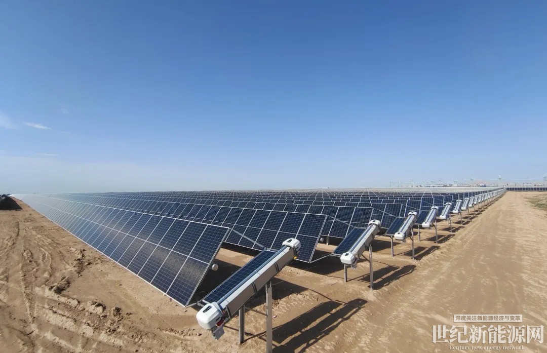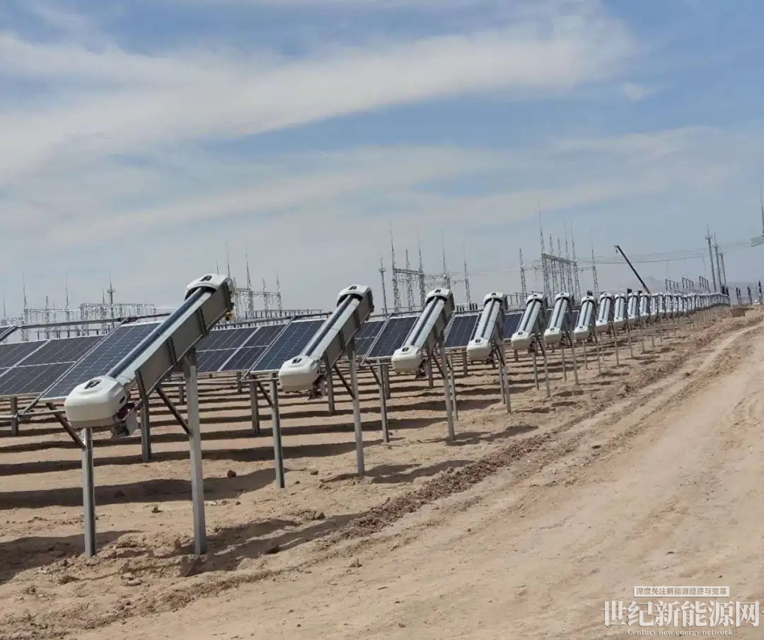 本项目采用第六代智能清扫机器人,具有轻量化、可扭转、强越障、低能耗、易维护等特点,尤其是突出的越障能力,在频繁受到风沙侵袭,清扫机器人清洁度可达到99.5%以上,大大降低了电站的灰尘损耗。同时,机器人实现与电站跟踪支架动态配合,单台最长运行里程达3000米,确保了光伏电站发电效率。