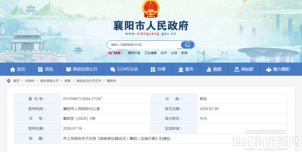 2024年7月19日,襄阳市人民政府发布关于印发《国家碳达峰试点(襄阳)实施方案》的通知。