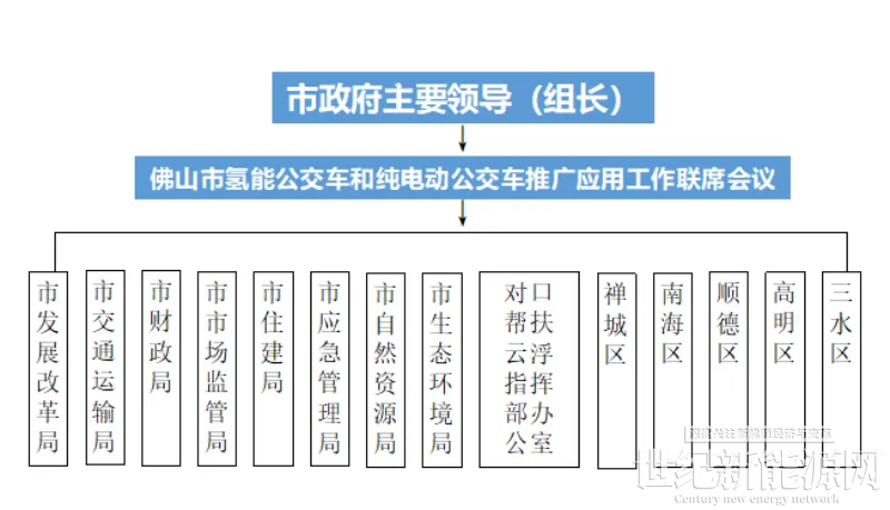 为完成氢能公交推广应用任务,佛山市成立以市政府主要领导为组长、各区和各部门主要负责人为成员的佛山市氢能公交车和纯电动公交车推广应用工作联席会议制度,统筹指导全市氢能公交车应用推广工作。各区人民政府、市相关单位根据职责分工,细化分解任务,做到目标、时间、措施、人员、保障“五落实”。