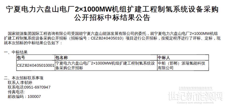 7月30日,宁夏电力六盘山电厂2×1000MW机组扩建工程制氢系统设备采购中标结果公示,中标人为中船(邯郸)派瑞氢能科技有限公司。