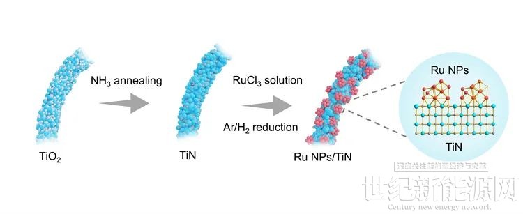 图1 Ru NPs/TiN的合成示意图由载体和贵金属组成的非均相催化剂是能量转换、化学合成和污染物降解等领域研究的重点。载体和金属的相互作用,会极大地影响催化剂的性能。团队研究发现,钌纳米颗粒与氮化钛载体之间具有强相互作用,能有效调节钌纳米颗粒的电子结构,优化氢中间体的吸附能,提高催化活性。
