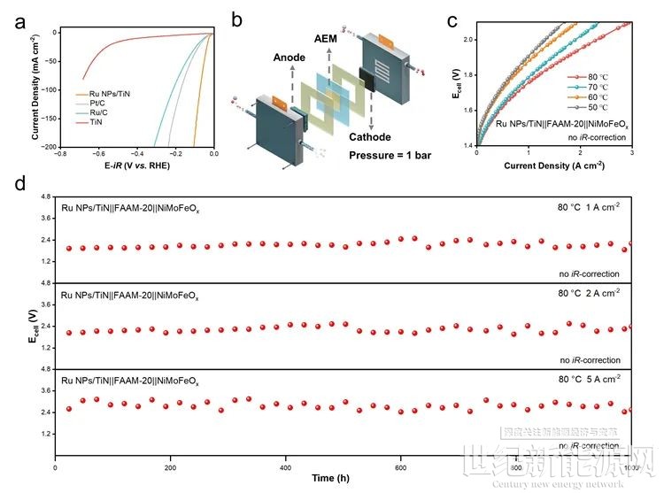 图2 (a) 三电极体系中Ru NPs/TiN与商业化Pt/C (20%)、Ru/C (5%) 性能对比“在5安培每平方厘米的工业级电流密度下,我们的研究成果能够在AEM电解槽中高效稳定运行,满足了AEM制氢大规模商业化应用的需求。”罗景山说,“未来,我们团队将继续投入到绿氢制备技术的自主研发之中,促进科技成果尽快转化落地,为构建零碳、低成本、安全可靠的绿氢能源供给体系贡献力量。”