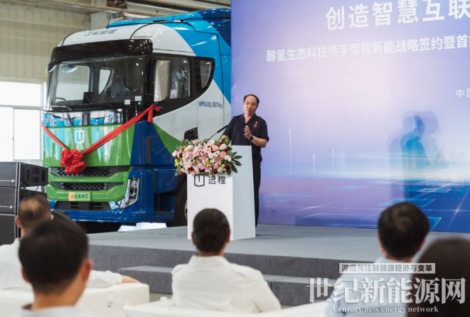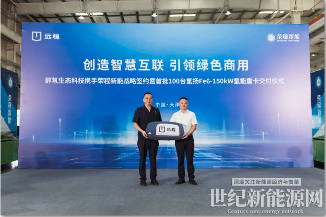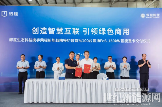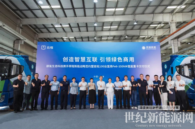 8月6日,醇氢生态科技-荣程新能集团首批100台氢燃料重卡交付仪式在远程新能源商用车天津生产基地隆重举行。交付的远程星瀚G氢燃料重卡将陆续投入到京津冀环渤海区域省际干线物流、钢铁、港口等大宗物资运输场景,助力京津冀绿色运力升级。