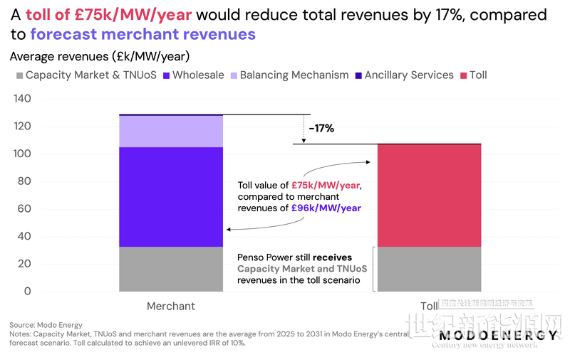 根据预计的 90 万英镑/兆瓦的资本支出,项目前七年每年 10.8 万英镑/兆瓦的收入将在 25 年的项目生命周期内提供10% 的无杠杆 IRR。不包括容量市场和 TNUoS 收入(我们假设这些收入留在 Penso),这意味着每年 75 英镑/兆瓦的收费可以为 Penso 带来适当的回报。