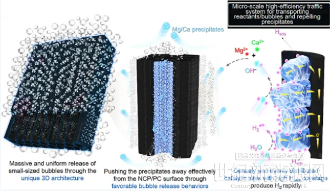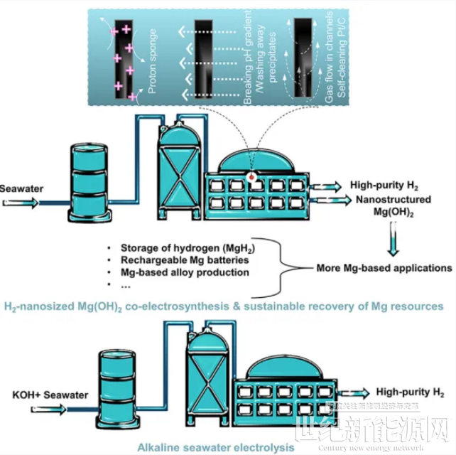 针对天然海水直接电解中阴极上镁钙(Mg2+/Ca2+)沉淀严重,电极活性位点被覆盖的难题,团队首次提出基于三维蜂窝电极的微气泡/沉淀输运系统,展示了具有高海水还原性能的独特电极构造。为海水电解存在的阴极沉淀问题提出了可靠的解决方案,并揭示了卓越抗沉淀性能的普遍原则(Nat. Commun., 2024, 15, 2950)。团队进一步探究了阴极抗沉淀的三种潜在策略,展示了从天然海水中共同电合成纳米级氢氧化镁和氢气的可能性,提出了氢气生产、氢气储存和镁资源回收的建议工艺(Chem, 2024, DOI: 10.1016/j.chempr.2024.05.018)。