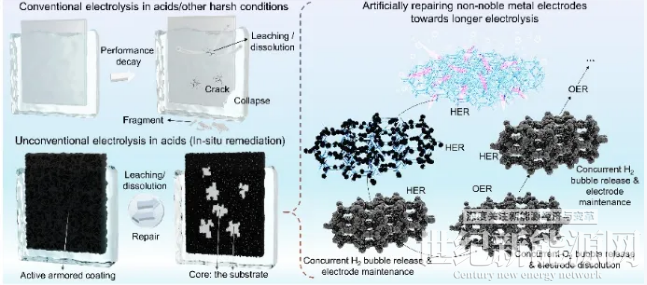 解决了阴极沉淀,海水直接电解还面临海水中氯离子侵蚀阳极、引发大量副反应导致的阳极催化效率低、稳定性差的困扰。针对这一难题,团队发展了C2O42−到CO32−的原位碳氧阴离子自转化(COST)策略,有效保护活性位点免受碱性海水氧化过程中Cl−侵蚀,实现长久、安培级碱性海水电解(Angew. Chem. Int. Ed., 2024, 63, e202316522);通过构筑高分散的微结构铬氧化物和铬阴离子稳定NiFe位点,利用均匀分布的OH?富集中心和抗Cl−吸附中心,从根本上提高了NiFe基电极碱性海水OER的活性、选择性和化学稳定性,实现了安培级电流密度下稳定电解海水2500h。(Nat. Commun., 2024, 15, 6624)。团队还提出电极保护外层策略来提高镍电极在苛刻条件下的使用寿命,使其在低pH溶液中以安培级电流密度进行交替电解长达93.8小时,使用寿命是传统水电解系统中镍电极的47倍。该工作有效证明了通过有效、重复的沉积-溶解过程在工程化苛刻电解条件进行长时间电解的可能性(Nat. Commun., 2024, 15, 6208)。