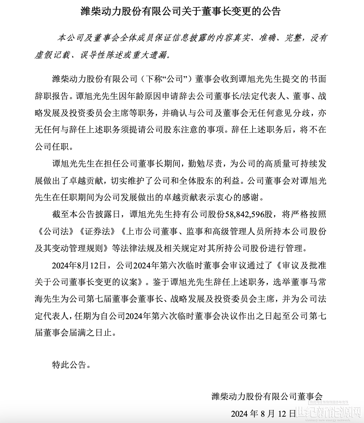近日潍柴动力发布公告称,谭旭光因年龄原因申请辞去公司董事长/法定代表人、董事、战略发展及投资委员会主席等职务,辞任上述职务后,将不在公司任职。