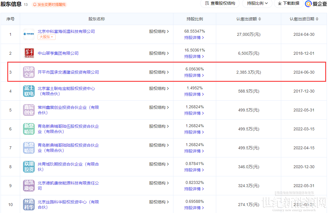 近日,中科富海(中山)低温装备制造有限公司完成股东变更。此次变动中,开平市国承交通建设投资有限公司作为新晋股东,以2385.32万元的认缴金额,成功持股6.0564%。