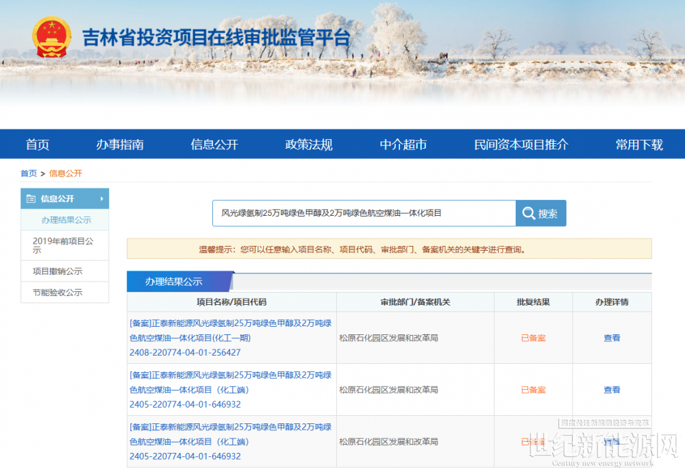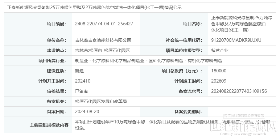 8月20日,正泰新能源风光绿氢制25万吨绿色甲醇及2万吨绿色航空煤油一体化项目(化工一期)获备案。