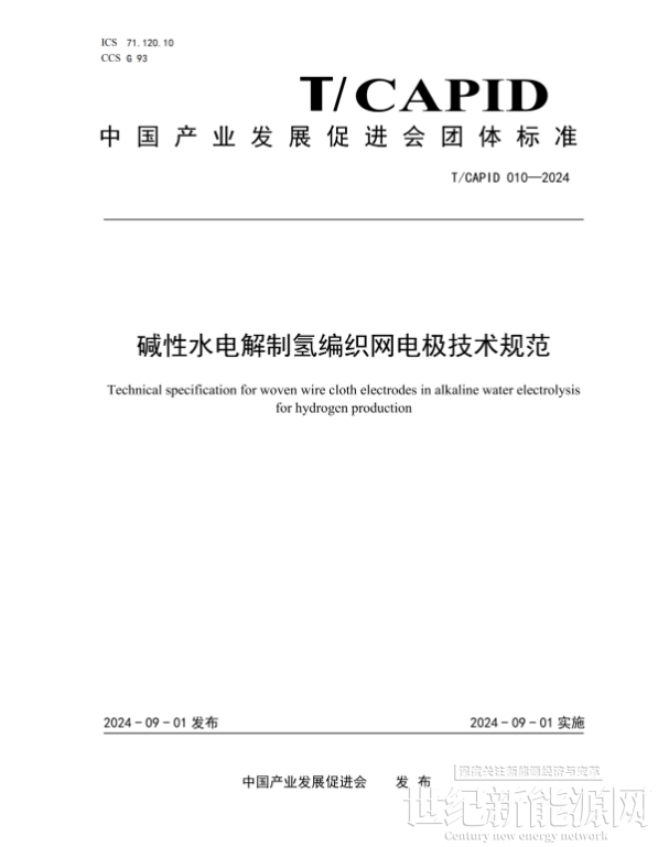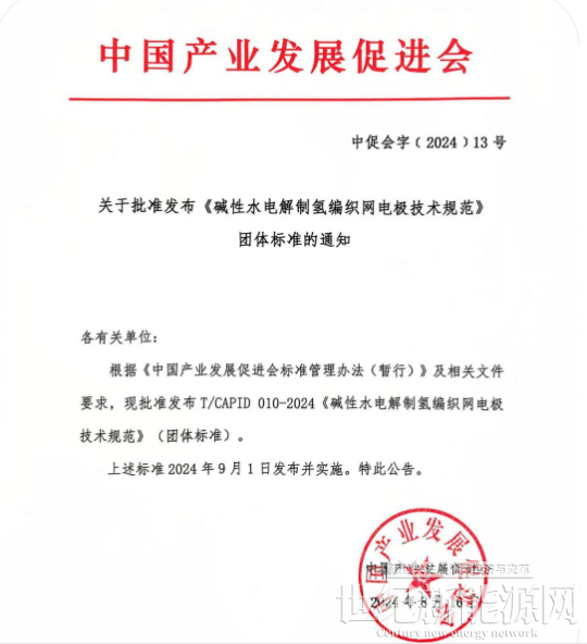 由中国产业发展促进会提出,由中国产业发展促进会氢能分会归口管理,保时来新材料科技(苏州)有限公司牵头,国家电投集团科学技术研究院有限公司、三一氢能有限公司、上海氢器时代科技有限公司、考克利尔竞立(苏州)氢能科技有限公司、中国产业发展促进会氢能分会、天津市大陆制氢设备有限公司、中石化石油化工科学研究院有限公司、宁夏宝丰能源集团股份有限公司、北京中电丰业技术开发有限公司、中船(邯郸)派瑞氢能科技有限公司、阳光氢能科技有限公司、中石油深圳新能源研究院有限公司、西安隆基氢能科技有限公司、中国华能集团公司、深能北方能源控股有限公司、苏州希倍优氢能源科技有限公司、南通安思卓新能源有限公司、北京电力设备总厂有限公司、江苏天合元氢科技有限公司、中国三峡新能源(集团)股份有限公司、三峡科技有限责任公司、中国大唐集团科学技术研究总院有限公司华北电力试验研究院、鄂尔多斯市瀚峡新能源有限公司、西安航天动力研究所、青岛绿色发展研究院有限公司、明阳智慧能源集团股份公司、中车株洲电力机车研究所有限公司、深圳市瑞麟科技有限公司、清华四川能源互联网研究院、航天长征化学工程股份有限公司、内蒙古霍煤鸿骏铝电有限责任公司电力分公司、清华大学、苏州大学、北京化工大学、华北电力大学、南京航空航天大学等单位参与编写的《碱性水电解制氢编织网电极技术规范》近日获得批准发布。