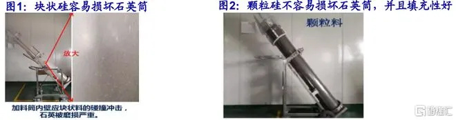 相比块状硅,颗粒硅减少了破碎环节,对石英加料筒的内壁冲击损耗低。颗粒硅填充性好,用加料桶可以多装15-20%的颗粒硅。