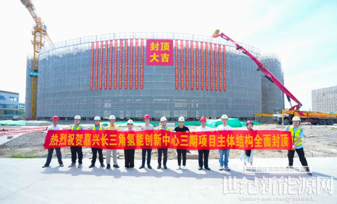 大红的缎带祝贺条幅垂挂在大楼外墙,金黄色的“封顶大吉”四个大字赫然高悬。8月20日,嘉兴长三角氢能创新中心三期项目迎来重要节点——主体结构全面封顶。