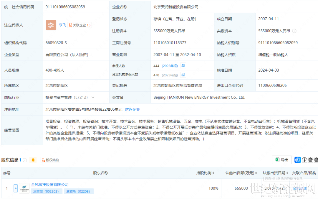 信息显示,吉林润金氢能科技有限公司由北京天润新能投资有限公司100%持股,后者则由金风科技100%持股。