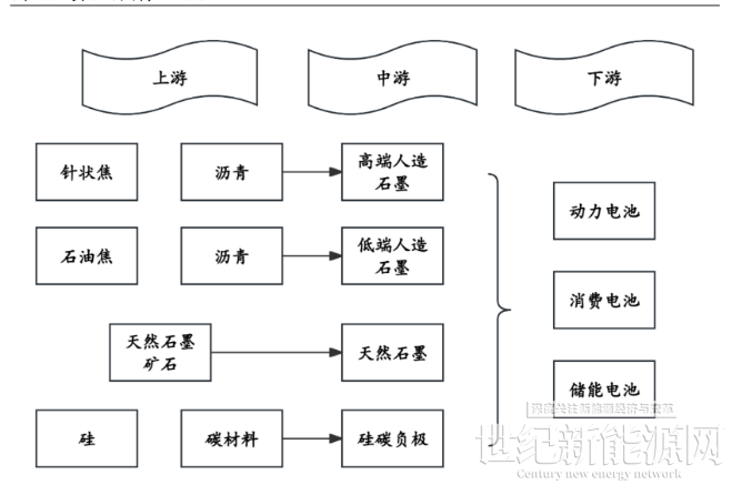 从锂电池负极材料产业链来看,上游为原材料,中游为制造加工商,下游为应用领域。