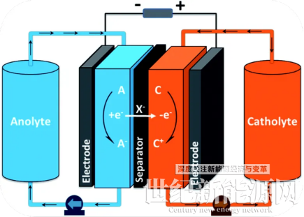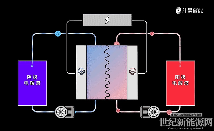 液流电池主要由三部分组成,外部电解液储罐以及内部的电极和离子传导膜。电解液置于电堆外部的储罐中,在循环泵的推动下流经电堆,并发生电化学反应,从而实现化学能与电能的转换。