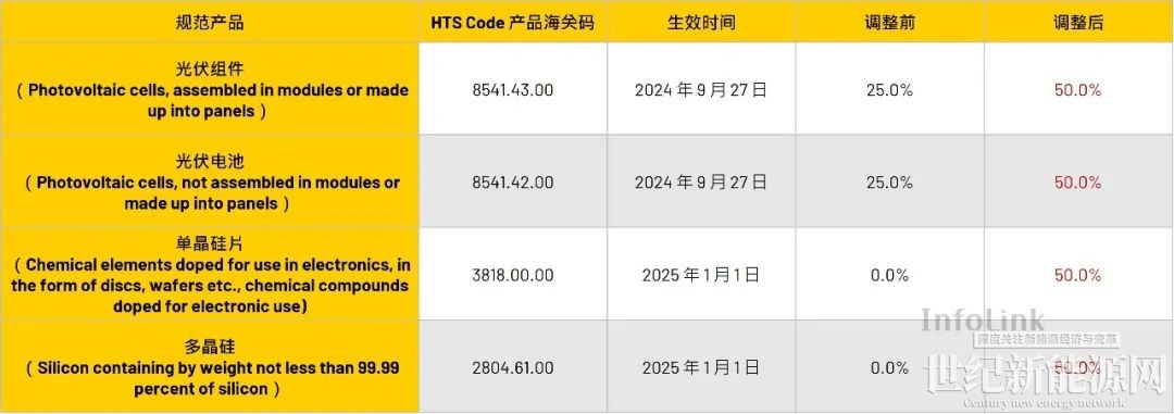 2024 年 9 月 13 日,美国政府调整对中国 301 关税的政策内容,其中对光伏电池、组件税率与五月公布的行政复审结果相同,确定从 25% 调整至 50%,但实施时间则从原先的 8 月 1 日延后至 9 月 27 日起。值得注意的是,本次 301 关税的规范产品额外新增了中国出口的多晶硅与单晶硅片,征收税率为 50%,并预计 2025 年 1 月 1 日起开始实施。