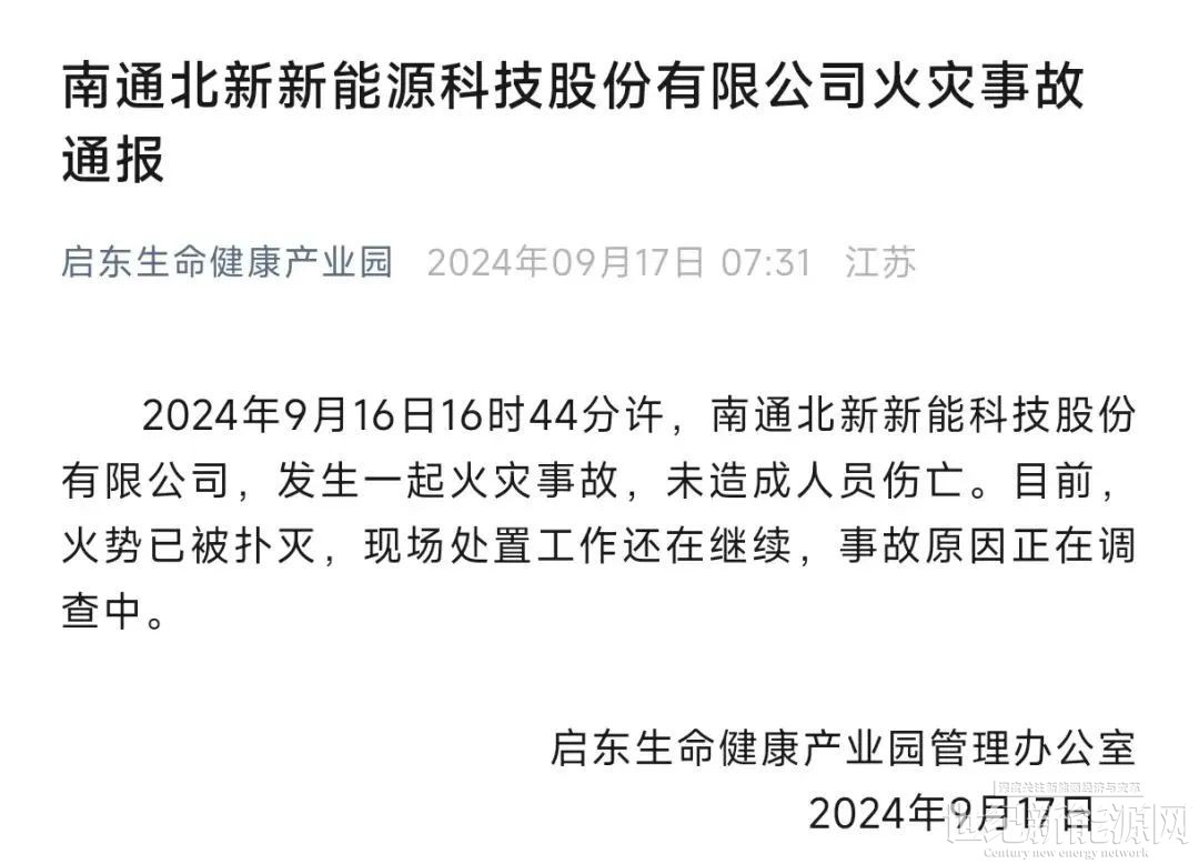 通报显示,2024年9月16日16时44分许,南通北新新能科技股份有限公司(下称“南通北新”),发生一起火灾事故,未造成人员伤亡。目前火势已被扑灭,现场处置工作还在继续,事故原因正在调查中。