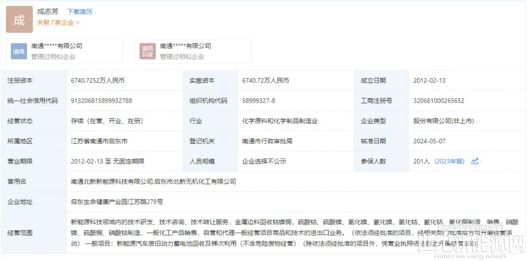 南通北新成立于2012年2月13日,法定代表人成志芳,注册资本约6740.73万元人民币,其主要经营范围为新能源科技领域内的技术研发、技术咨询、技术转让服务金属边料回收钴镍铜,硫酸钴、硫酸镍、氮化镍、氧化镍、氯化钴等制造,一般项目包括新能源汽车废旧动力蓄电池回收及梯次利用。