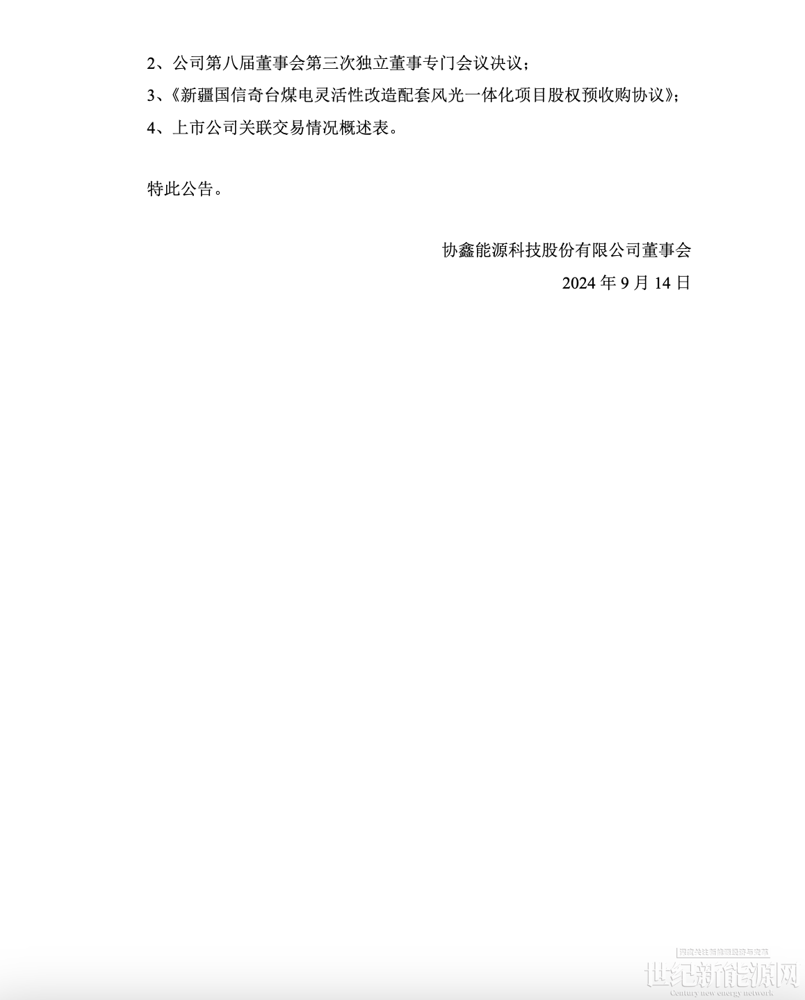 各方就本次股权预收购事项达成一致,并于2024年9月13日在苏州签署了《新疆国信奇台煤电灵活性改造配套风光一体化项目股权预收购协议》。协议指出,股权收购的主要条件之一为,目标项目原则应于2025年12月31日前实现并网发电。