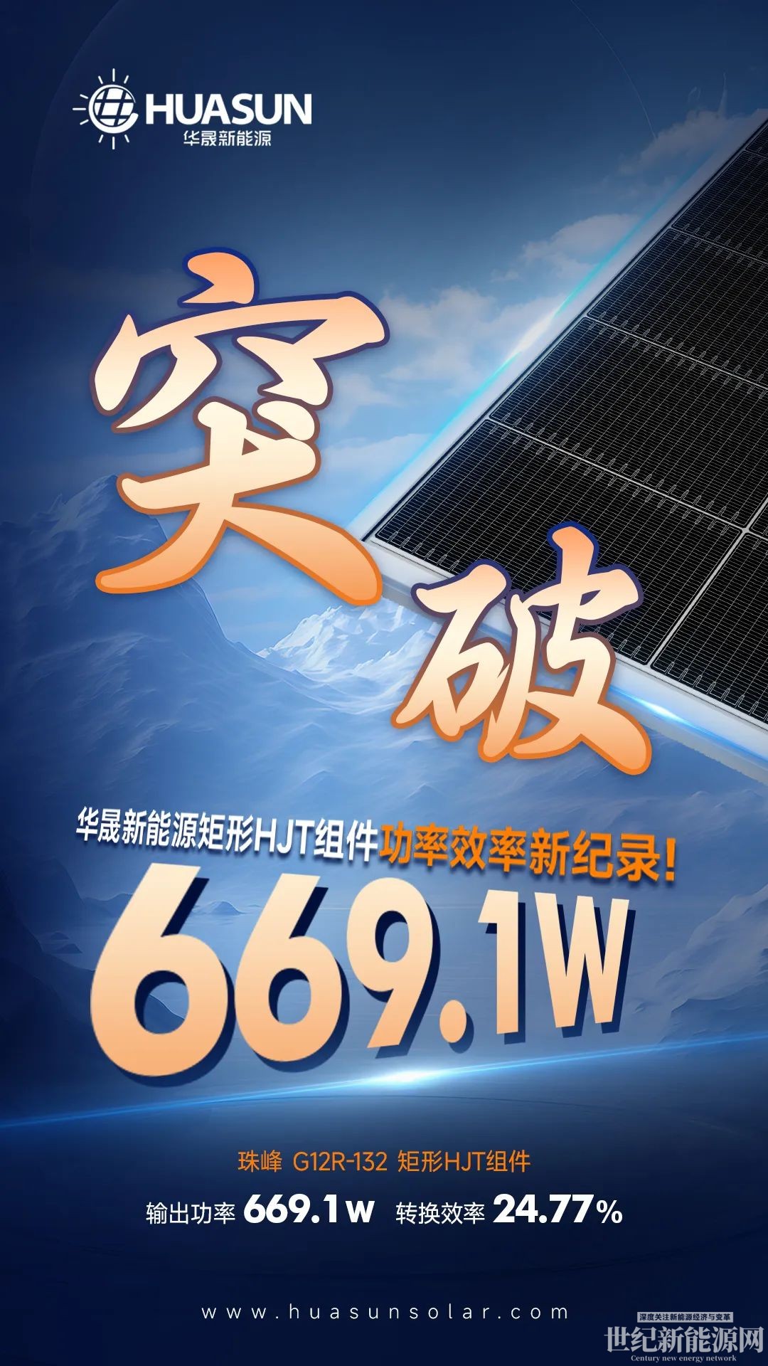 秋深露浓,寒意渐盛,华晟异质结却势头火热。经国际权威测试机构认证,近日,华晟珠峰系列G12R-132版型组件实现新突破:最高冠军组件功率达到669.1W,同时以24.77%的转换效率再创异质结行业巅峰。这是继国庆前夕,华晟喜马拉雅G12-132版型组件刚打破世界功率效率纪录后的又一里程碑式突破!