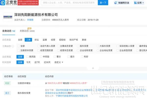 近日,深圳先阳新能源技术有限公司(以下简称:先阳新能源)发生工商变更,注册资本由500万人民币增至4.95亿人民币,增幅达9800%,公司注册资本上升的同时,宁德时代持股也出现上升,现持股比例为99.5051%。