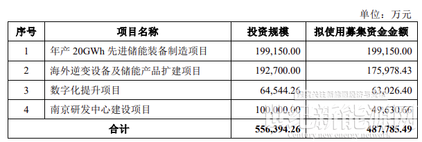 上述发行GDR的募集资金为美元,募集资金总额(含发行费用)折算后不超过人民币48.78亿元,其中37.6亿元用于储能产能扩张。本次募集资金总额在扣除发行费用后的净额拟全部用于以下项目:计划斥资近20亿元用于建设年产20GWh先进储能装备制造项目;17.6亿元用于海外逆变设备及储能产品扩建项目、6.3亿元用于数字化提升项目,4.96亿元用于南京研发中心建设项目。