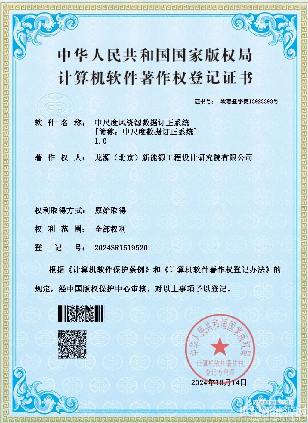 近日,龙源电力设计院自主研发的中尺度风资源数据订正系统获得国家版权局颁发的计算机软件著作权登记证书。该系统通过融入更多现场实测数据,对原有风资源数据进行深入优化,显著提升了风资源评估的精准度。