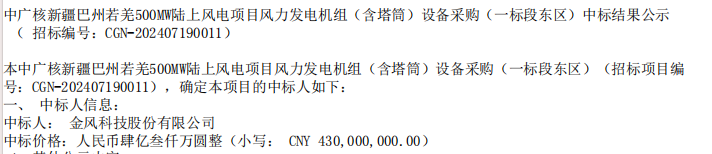 公告显示,金风科技股份有限公司成功中标一标段东区、二标段西区,中标价格均为430,000,000.00元。