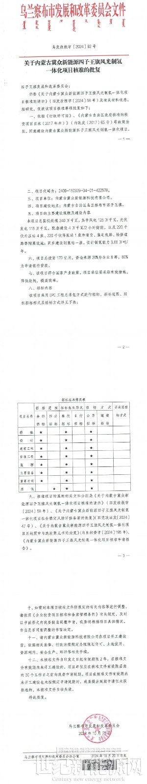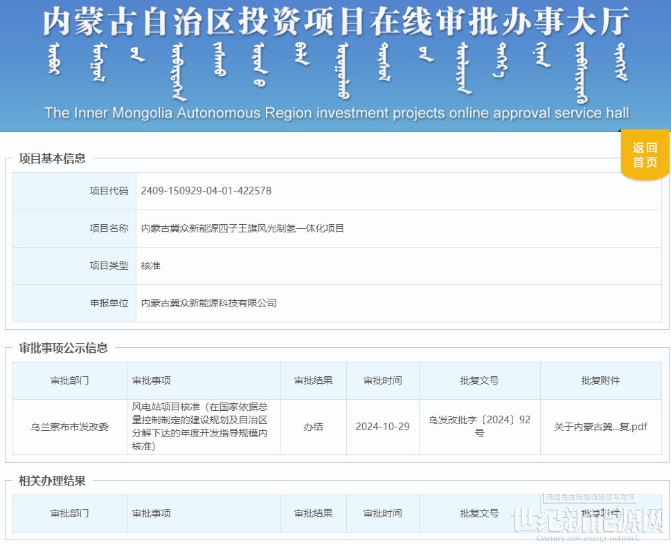 10月29日,内蒙古自治区投资项目在线审批办事大厅网站发布关于内蒙古冀众新能源四子王旗风光制氢一体化项目核准的批复。