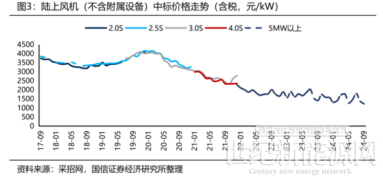 根据太平洋证券统计的数据,整机价格在今年4月降到了目前的最低点,该月有新疆华电天山北麓基地610万千瓦新能源项目风力发电机组(含塔筒)采购(4.2GW)开标等。