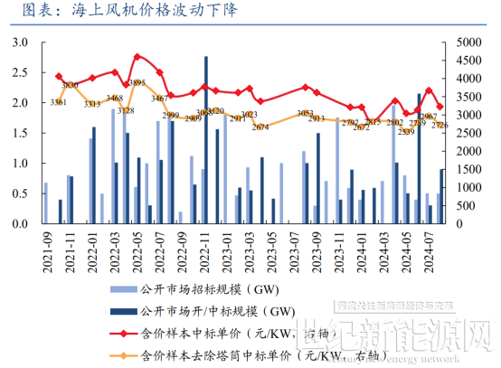 而海上风机不含塔筒价格目前在2500-2700元/kW徘徊,但随着更大风机逐步投入使用,价格还有下降的空间。