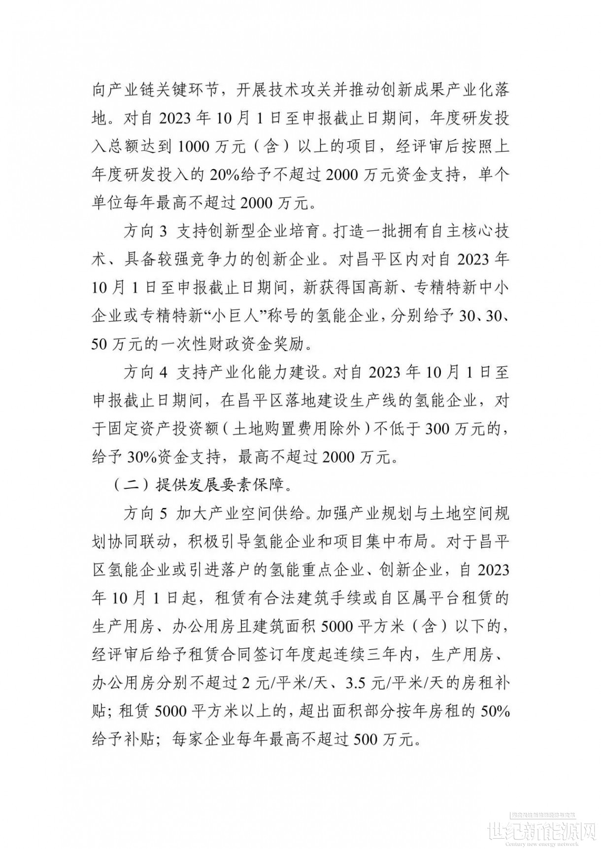 方向5:加大产业空间供给。对于昌平区氢能企业或引进落户的氢能重点企业、创新企业,自2023年10月1日起,租赁有合法建筑手续或自区属平台租赁的生产用房、办公用房且建筑面积5000平方米(含)以下的,经评审后给予租赁合同签订年度起连续三年内,生产用房、办公用房分别不超过2元/平米/天、3.5元/平米/天的房租补贴;租赁5000平方米以上的,超出面积部分按年房租的50%给予补贴;每家企业每年最高不超过500万元。