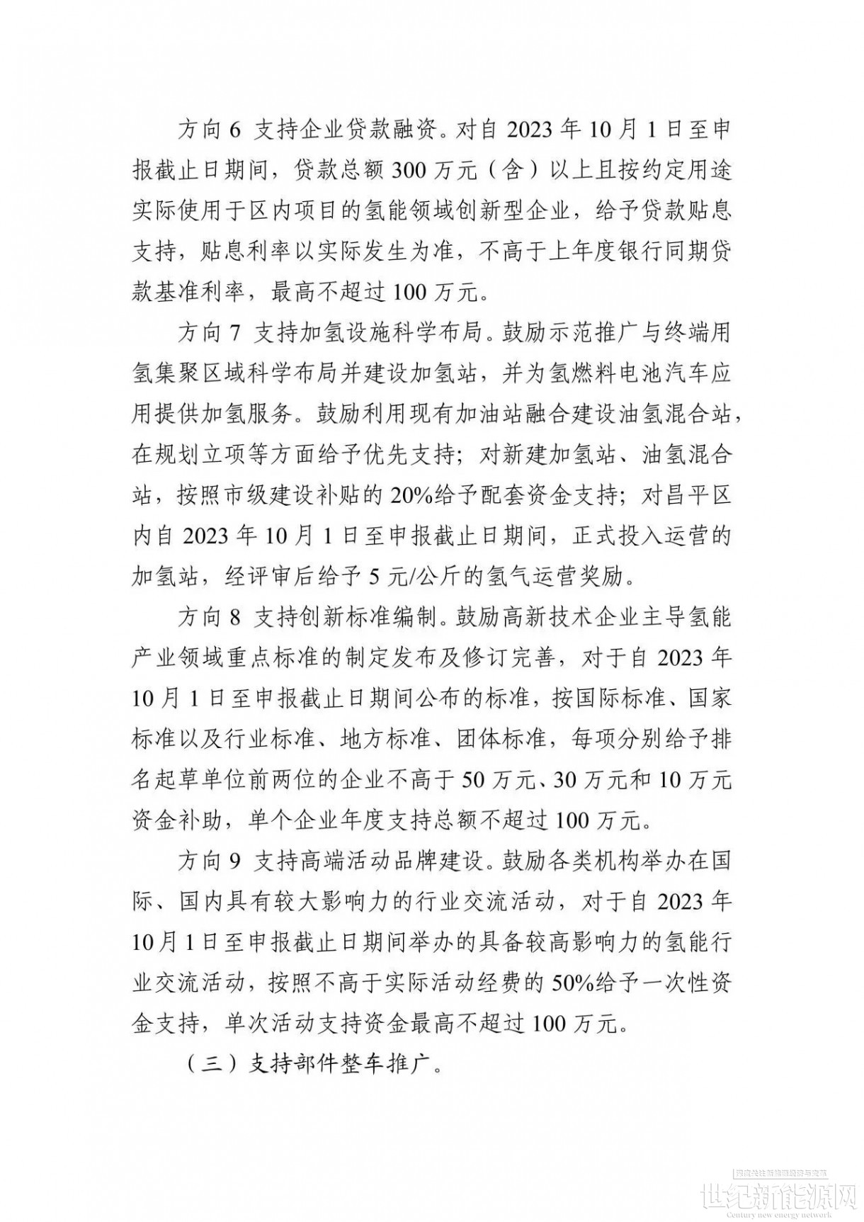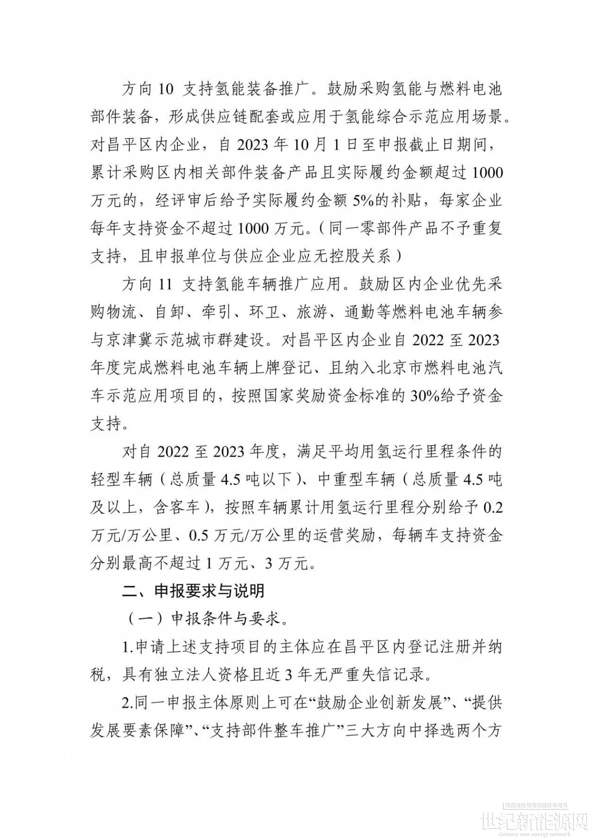 方向10:支持氢能装备推广。对昌平区内企业,自2023年10月1日至申报截止日期间,累计采购区内相关部件装备产品且实际履约金额超过1000万元的,经评审后给予实际履约金额5%的补贴,每家企业每年支持资金不超过1000万元。(同一零部件产品不予重复支持,且申报单位与供应企业应无控股关系)