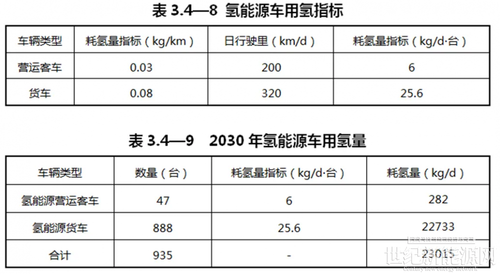 《通知》进一步对区内加氢站规模预测,文件指出,氢燃料电池公共汽车储气瓶容积为8×140L,氢燃料电池货车辆的储气瓶容积为3×140L,氢燃料电池公共汽车每百公里耗氢2.8—3kg和氢燃料电池货车辆每百公里耗氢约为6—8kg,氢燃料电池公共汽车每次加氢约为5—6kg和氢燃料电池货车每次加氢约18—20kg。本次计算按照氢能源公共汽车每天行驶200km,耗氢量指标为每百公里3kg;氢能源货车每天行驶320km,耗氢量指标为每百公里8kg计算。氢能源用氢量如下表。