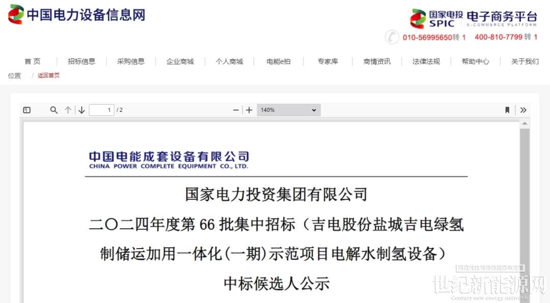 11月1日,国家电投电子商务平台公布吉电股份盐城吉电绿氢制储运加用一体化(一期)示范项目电解水制氢设备中标候选人。