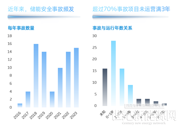 永远不要觉得储能安全事故只是小概率事件,其实风险往往就潜藏在我们身边,就在今年4月底,德国的一个锂离子电池储能集装箱发生起火事故,并导致两名消防员受伤,5月份,美国加州一座曾被誉为世界最大的锂离子电池储能电站发生火灾,,并持续燃烧了五天!随着储能装机规模的增加,从2018年开始,几乎每年都有超10起以上的储能重大安全事故,并且值得注意的是,超过70%的事故项目运营不满3年。