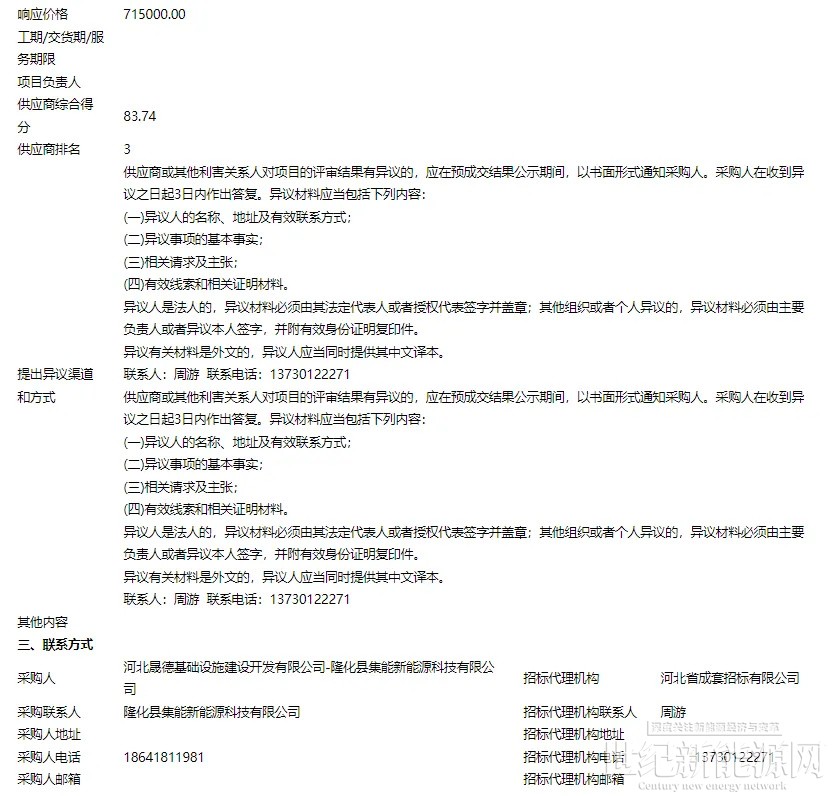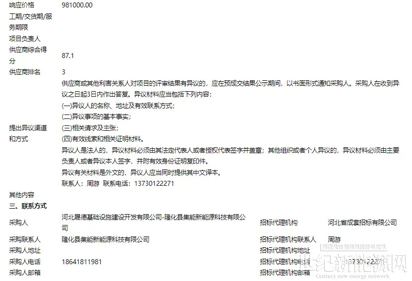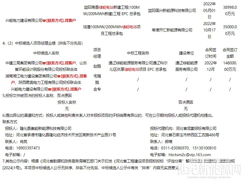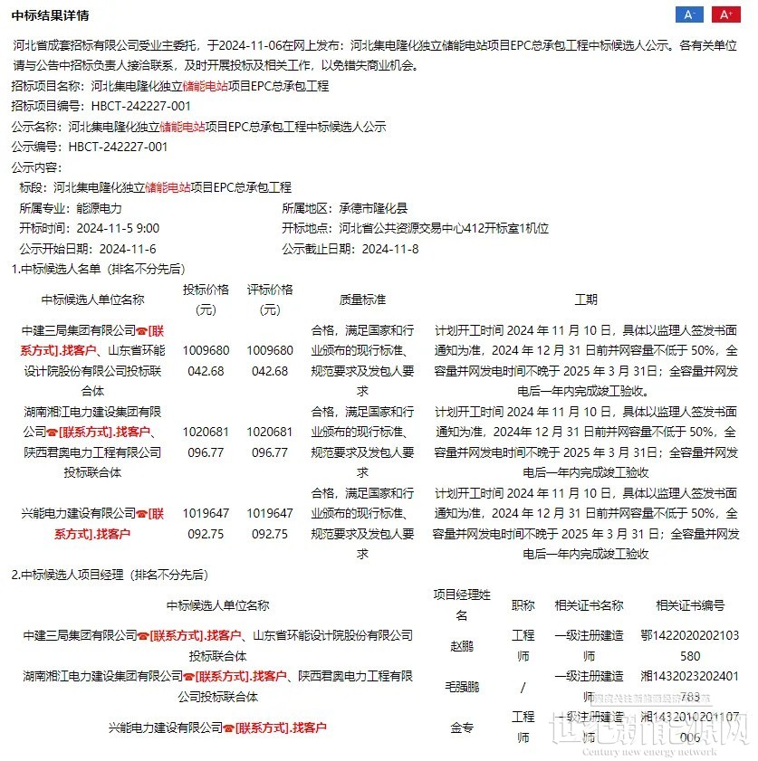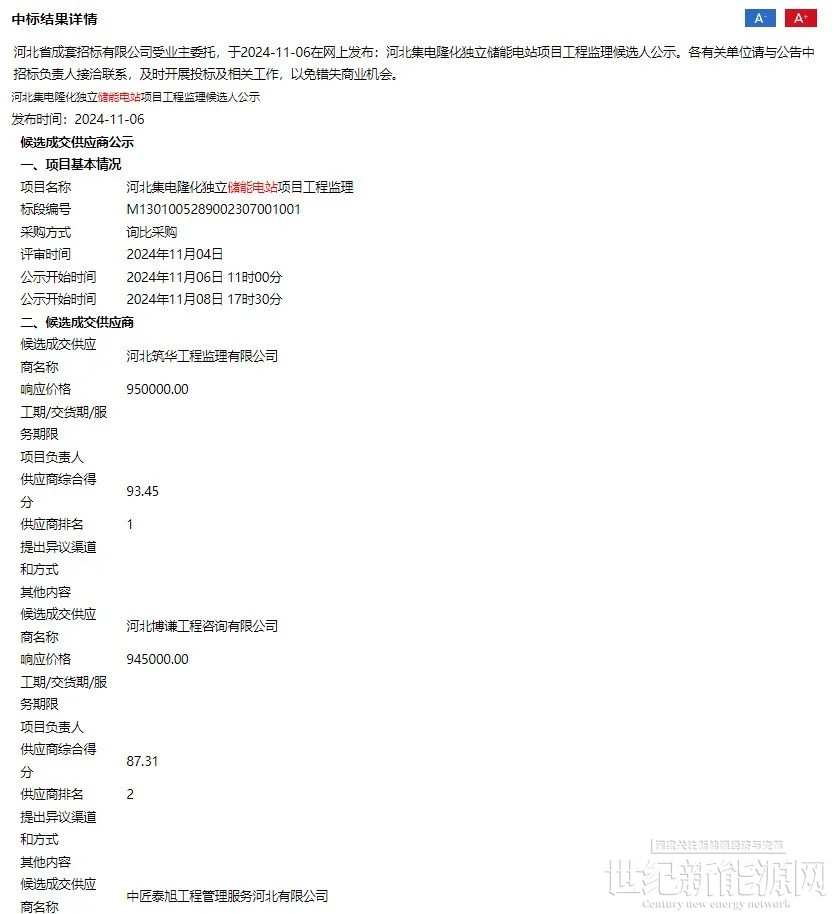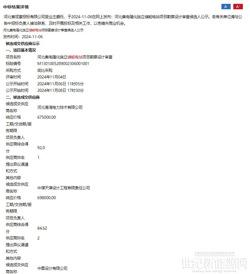 11月6日,河北集电隆化独立储能电站项目EPC总承包工程、项目工程监理及项目勘察设计审查中标候选人公示。