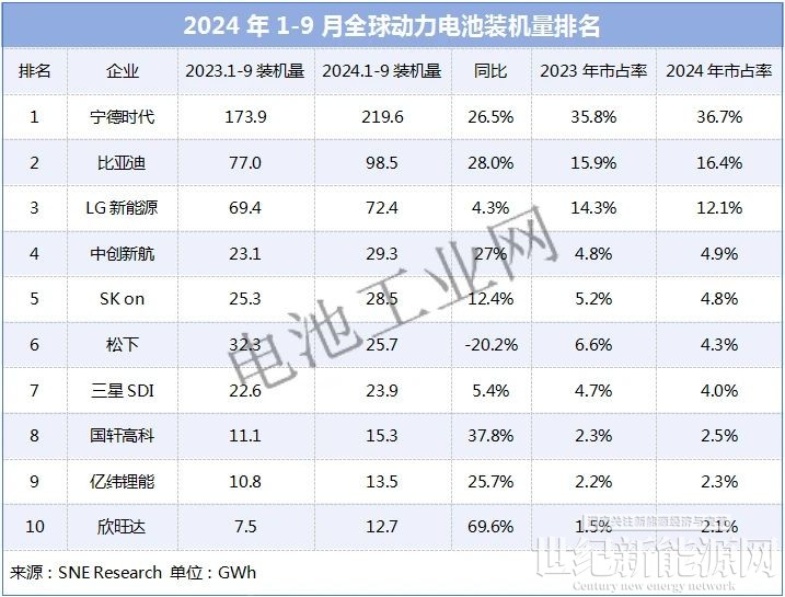 11月6日,韩国研究机构SNE Researc公布2024年1-9月全球动力电池装机量最新数据。1-9月,全球动力电池装机量达599GWh,同比增长23.4%。
