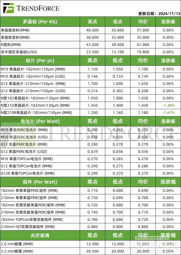 11月14日,集邦新能源发布最新光伏产业链价格。