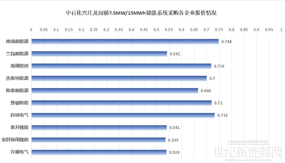 近日,中国石化江苏油田兴庄及闵桥7.5MW/15MWh储能系统采购开标,信息显示共有10家企业参与,投标单价在0.535-0.748元/Wh之间,平均报价0.64元/Wh。