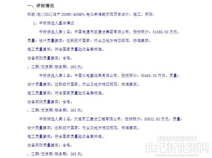 11月19日,洛宁200MW/400MWh电化学储能示范项目(一标段)中标候选人公示。