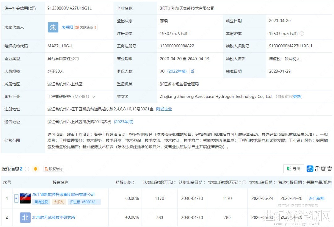 浙江浙能航天氢能技术有限公司为国有控股公司,股东分别为浙江省新能源投资集团股份有限公司、北京航天试验技术研究所。