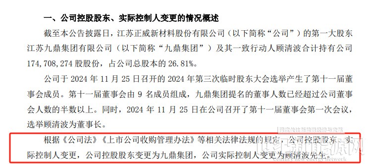 11月26日,正威新材公告称,九鼎集团及其一致行动人顾清波合计持有公司1.75亿股股份,占公司总股本的26.81%。经过会议选举,公司控股股东、实际控制人变更,公司控股股东变更为九鼎集团,公司实际控制人变更为顾清波先生。