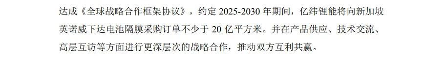 根据公告,2025-2030年期间,亿纬锂能预计将向新加坡英诺威下达电池隔膜采购订单不少于20亿平方米,双方在产品供应、技术交流高层互访等方面进行更深层次的战略合作,推动双方互利共赢。按10月均价计算,20亿平方米的价值约29.6亿元。