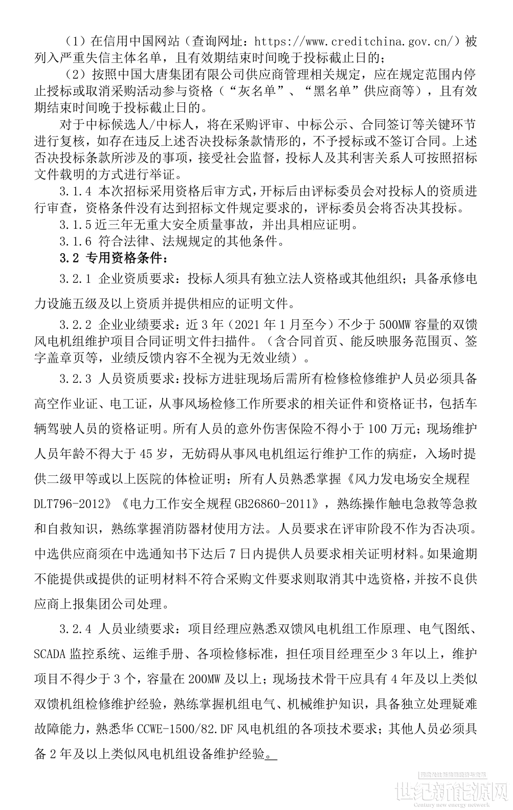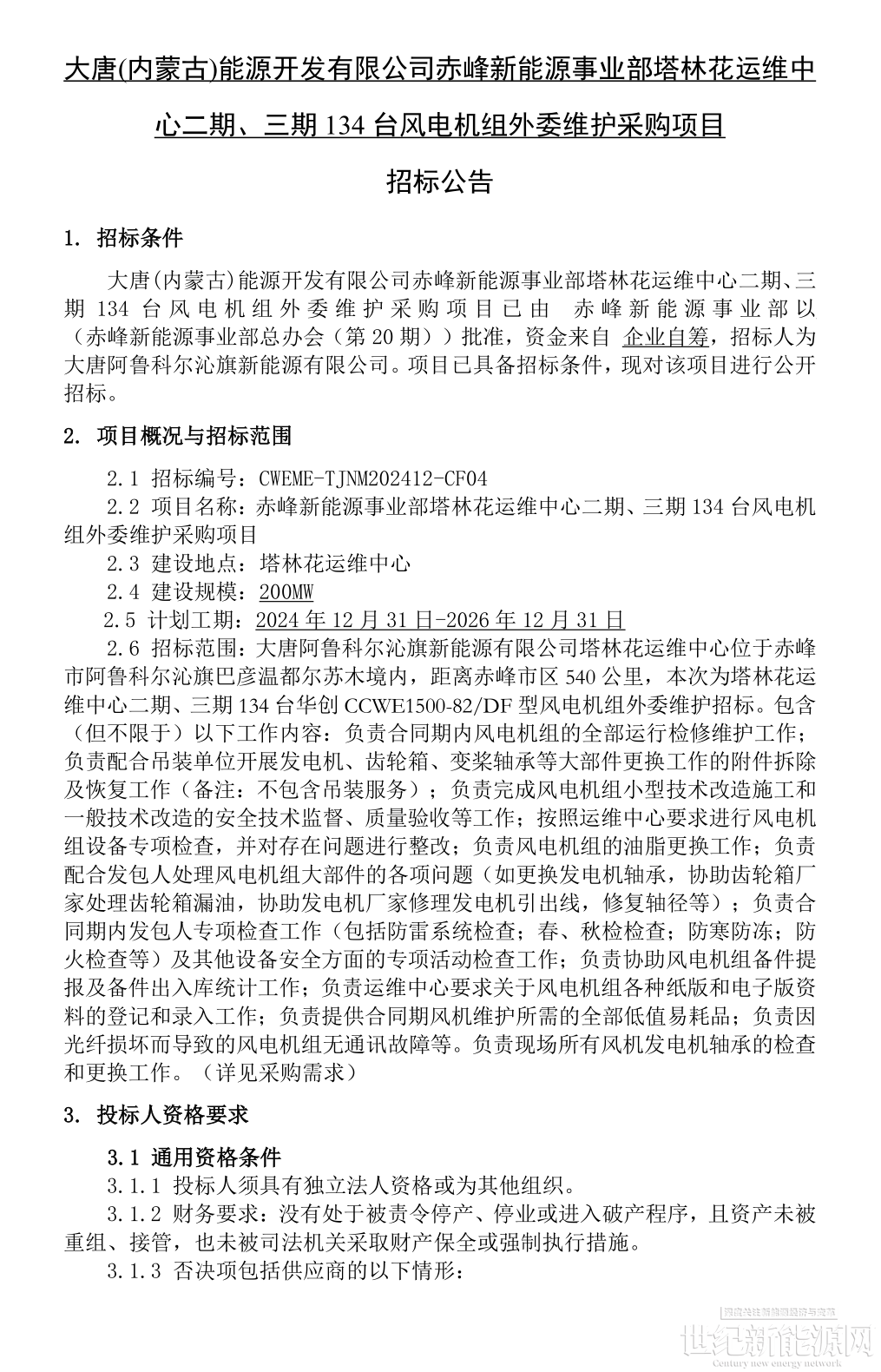 11月26日,大唐(内蒙古)能源开发有限公司赤峰新能源事业部塔林花运维中心二期、三期134台风电机组外委维护招标。