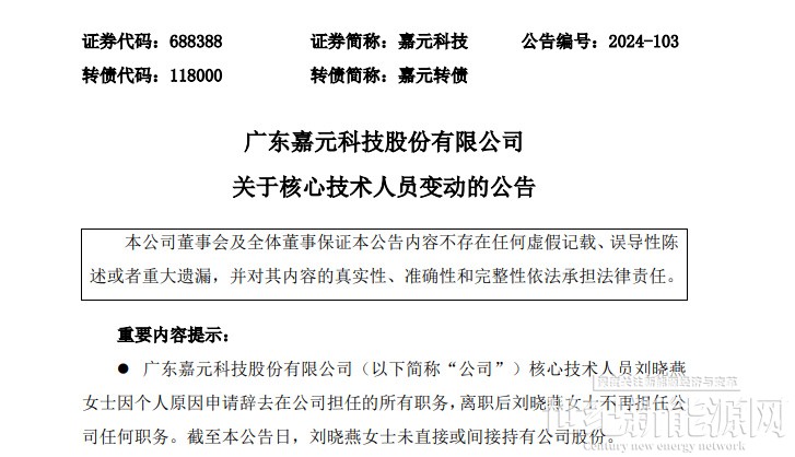 11月29日,嘉元科技发布“核心技术人员变动”的公告,其中提及公司核心技术人员刘晓燕女士因个人原因申请辞去在公司担任的所有职务,离职后刘晓燕女士不再担任公司任何职务。